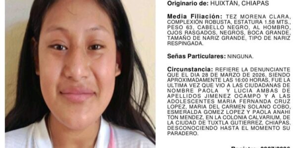Tuxtla Gutiérrez, 30 de marzo de 2026.- Seis jóvenes de entre 14 y 22 años fueron reportadas como desaparecidas desde una casa hogar en Tuxtla Gutiérrez, Chiapas. La desaparición se reportó la noche del sábado 28 de marzo de 2026….