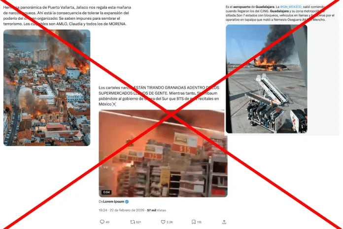 La ola de contenido falso incluyó videos manipulados que simulaban ataques armados contra el Aeropuerto Internacional de Guadalajara y supuestos incendios masivos en diversas zonas del país, contenidos que resultaron ser montajes digitales o material de archivo descontextualizado. Una publicación específica difundida a través de la red social X logró 4.7 millones de vistas y más de 53 mil ‘me gusta’ antes de ser identificada como desinformación, evidenciando la velocidad de propagación de estas narrativas diseñadas para generar pánico entre la población civil.